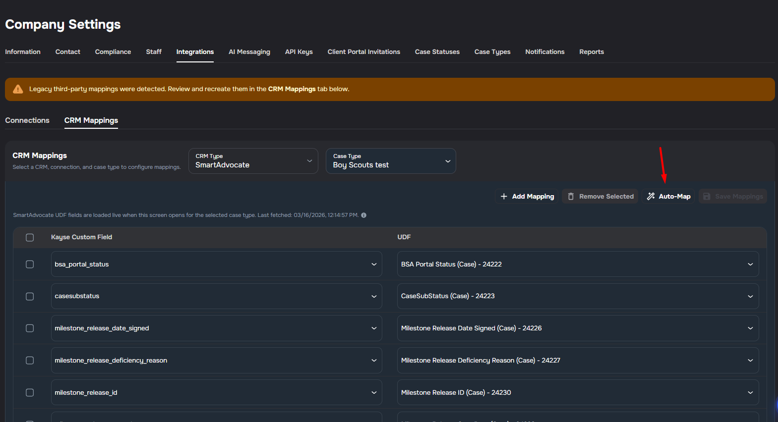 Auto-Map button - run automatic matching from Company Settings > Integrations > CRM Mappings