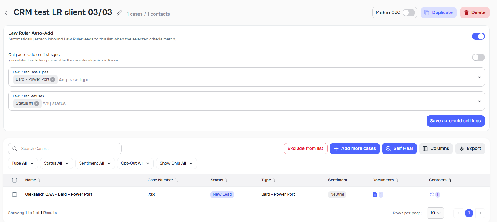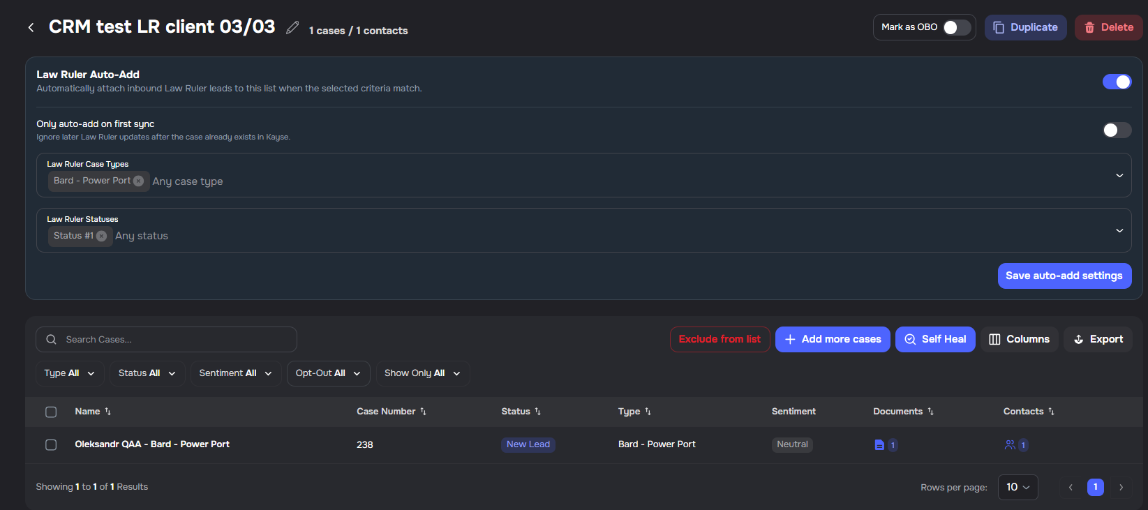 Auto-add on lead create/update β enable auto-add on any case list to automatically add LawRuler leads that match the configured criteria when they are created or synced