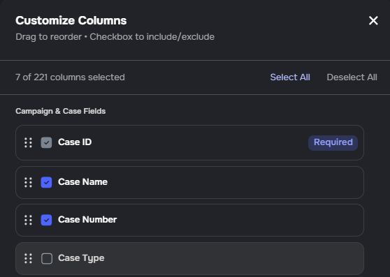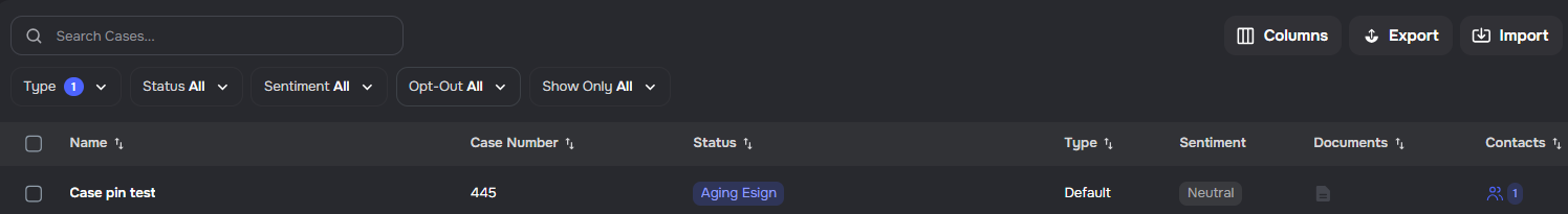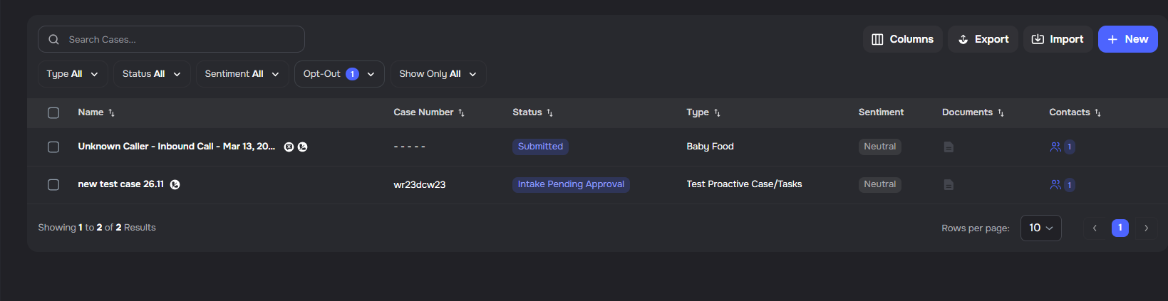 Cases and List detail pages now include Columns and Export buttons to make exporting data easier and more flexible.