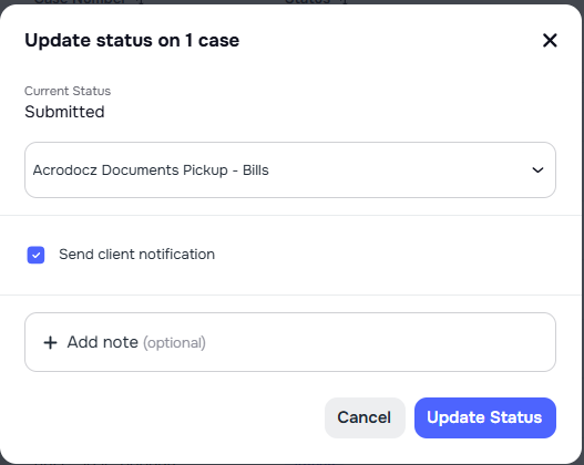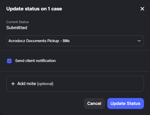 Single status update β a toggle lets you include or exclude a client notification when updating one case's status