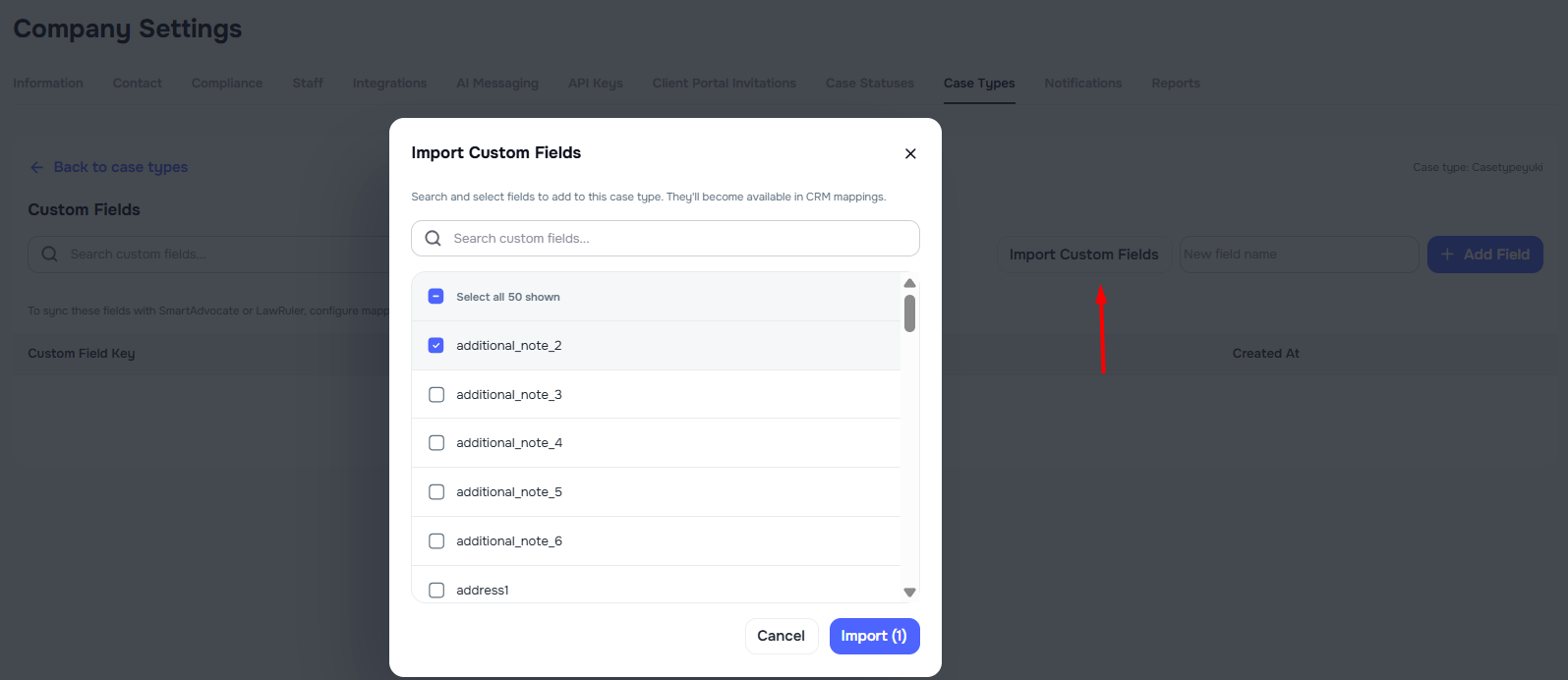 Import existing fields - add one or more existing company custom fields to the selected case type