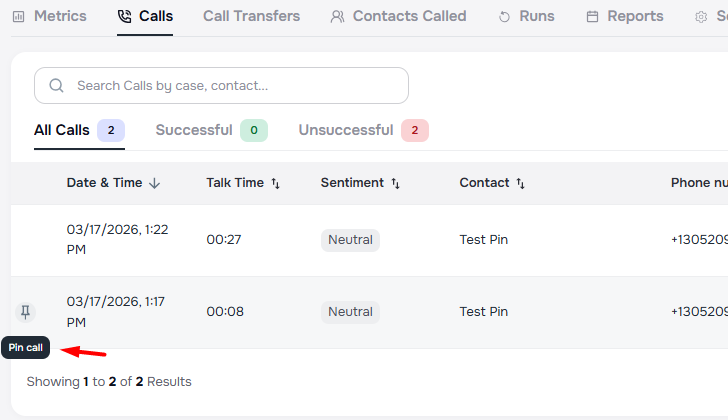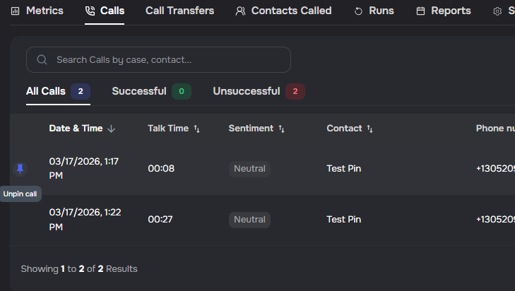 You can now pin important calls within an AI campaign's call list so they're easy to find later.