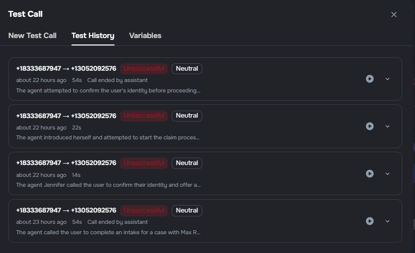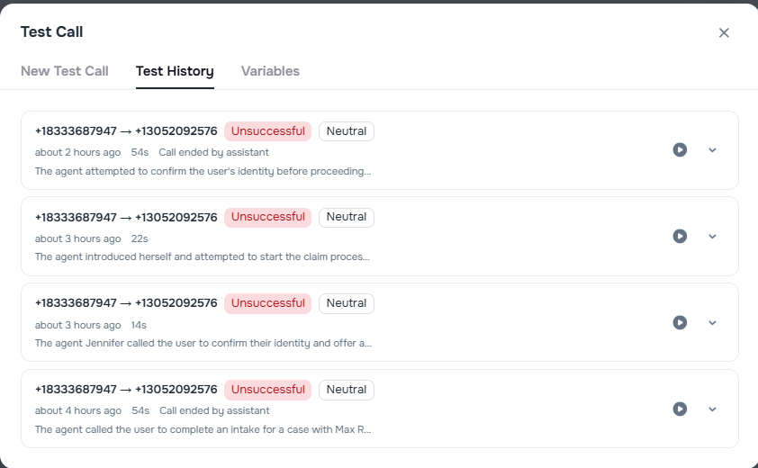 Transcript history β view a list of previous test calls with timestamps and outcomes