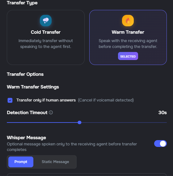 Removed options β on-hold music, warm transfer mode, and IVR navigation controls have been removed from the transfer configuration UI