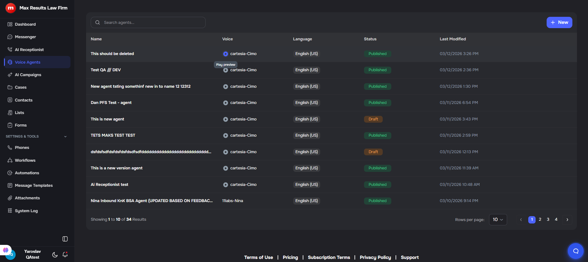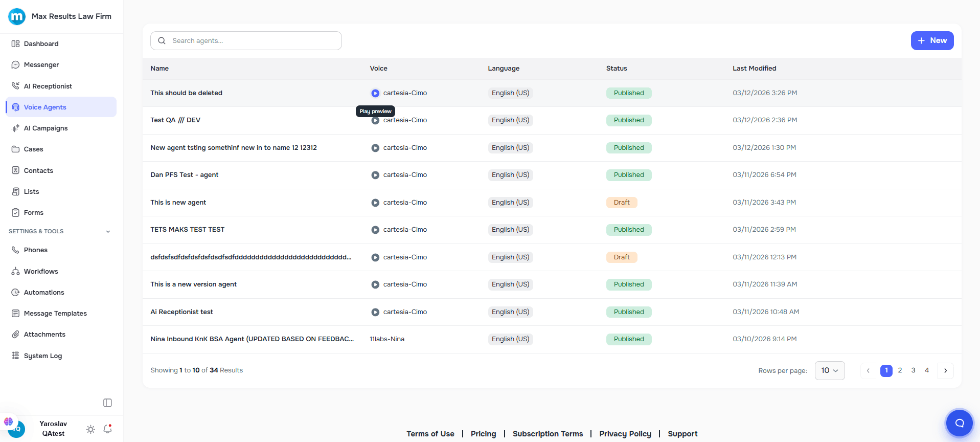 Instant playback β click the play button next to each agent's voice to hear a preview