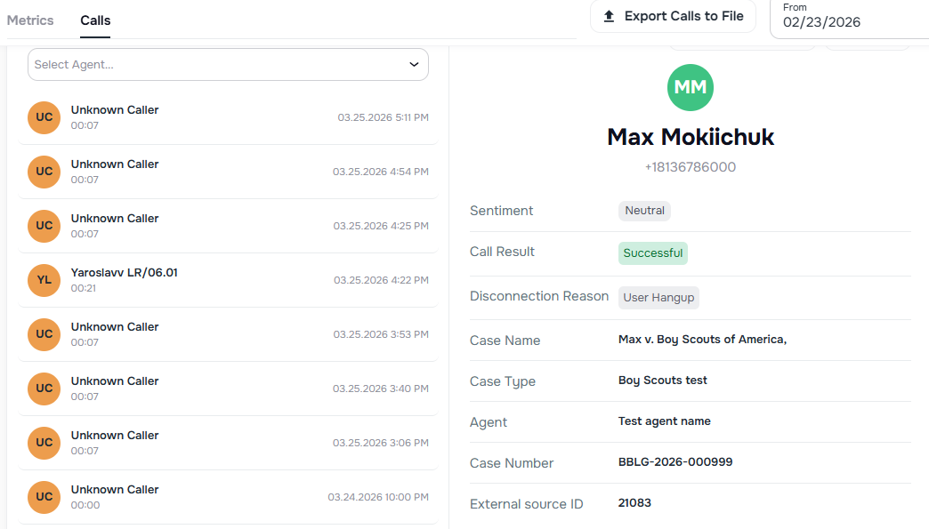 - Agent identification — see which agent processed each call directly in the call detail view