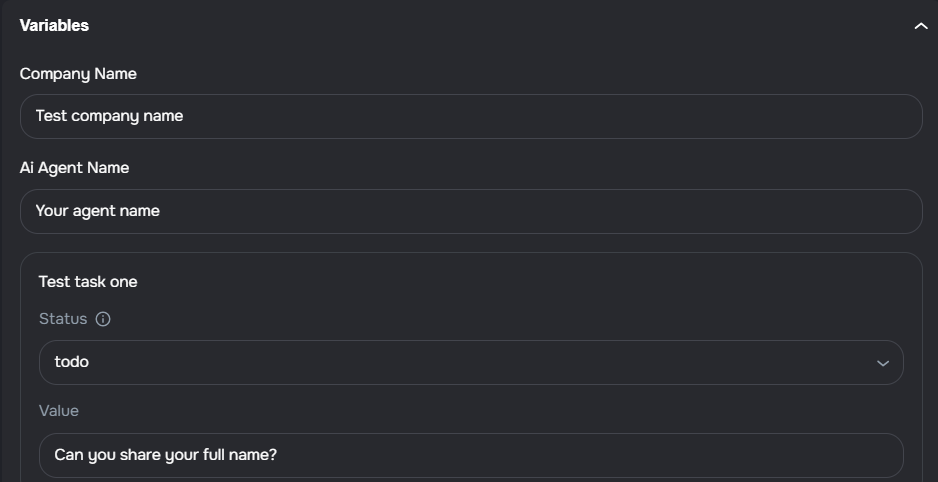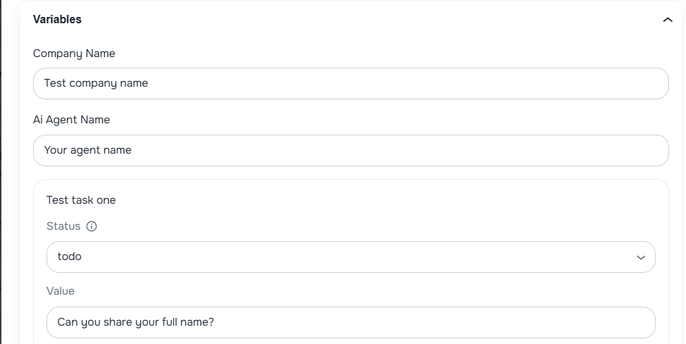 - Pre-fill variables before calling — the Test panel now surfaces all dynamic variables defined in the agent prompt, with human-readable labels derived from the form structure (e.g. task titles, field types, and options)