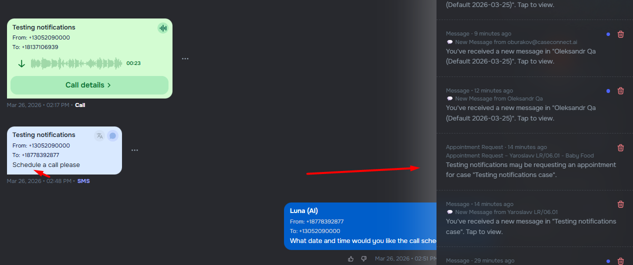 Users can now manage whether clients receive SMS and email notifications when a case status changes by using a dedicated checkbox in settings.