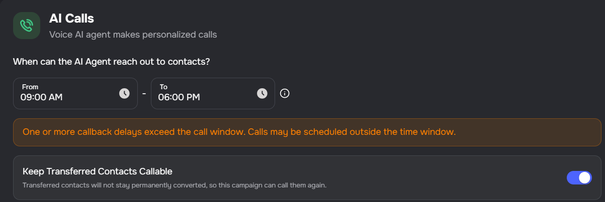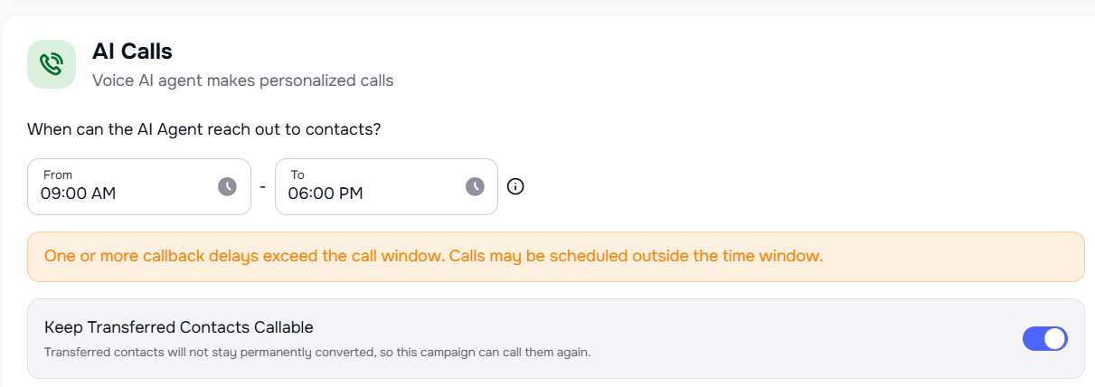 Transfer campaigns now include a Keep Transferred Contacts Callable toggle in AI Calls settings.