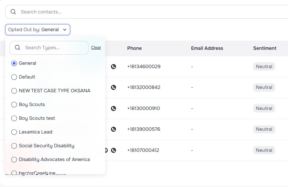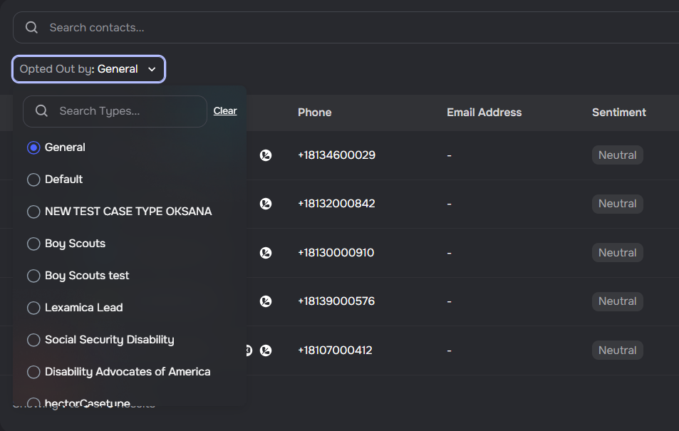The contacts list now includes a General option in the opt-out filter dropdown, letting you filter contacts who have opted out of all voice calls globally — not scoped to any specific case type.