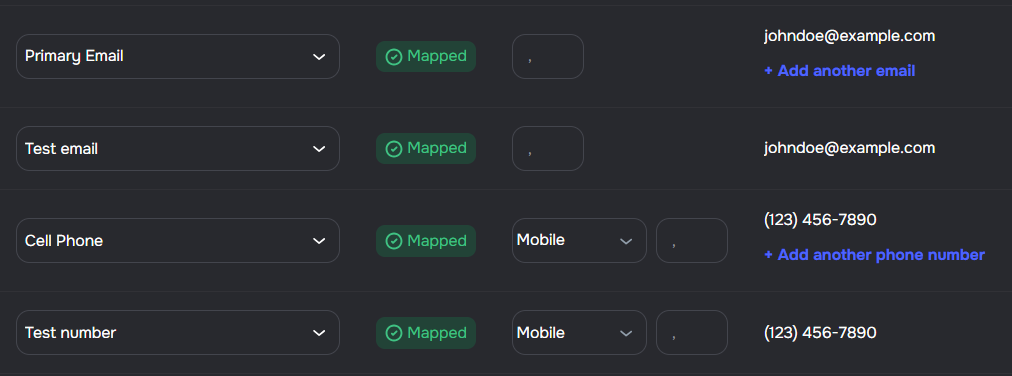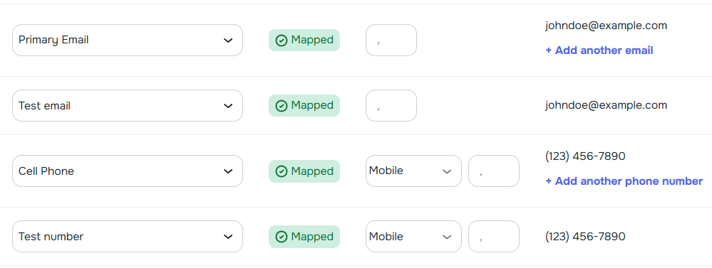 - Multiple mappings per field — add more than one row for Email and Phone Number mappings