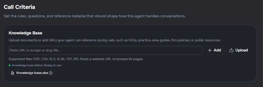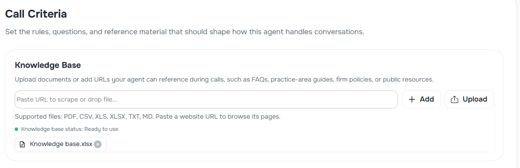 - Knowledge base support — attach a knowledge base during setup so the agent can reference FAQs and firm policies from the first call