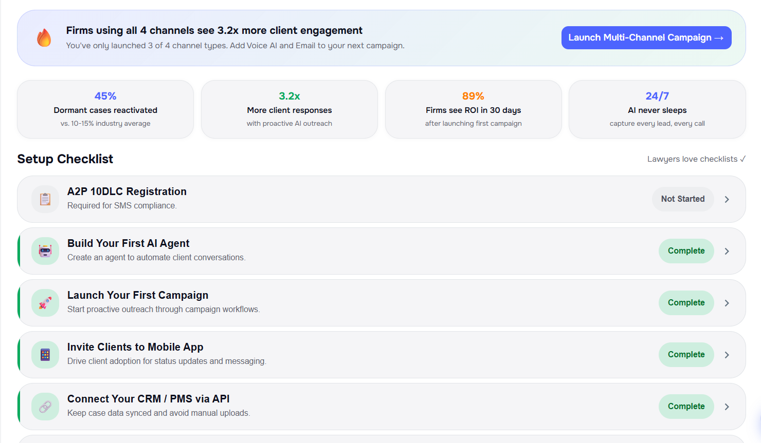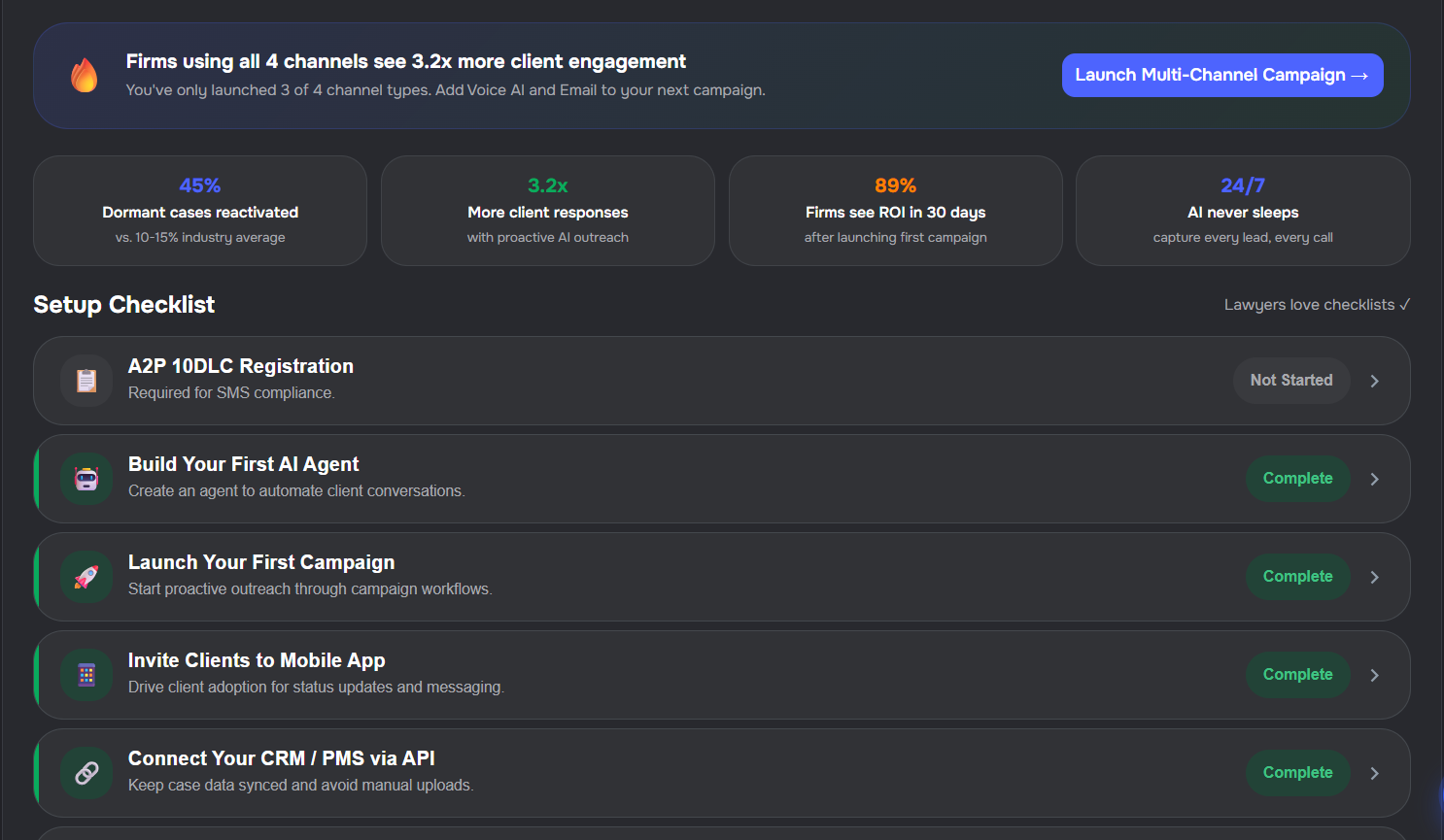 - Full dashboard — open Settings → Company → Onboarding for a setup checklist with live status, progress, platform stats, contextual nudges, and quick actions (campaigns, agent builder, mobile app, compliance, and more)