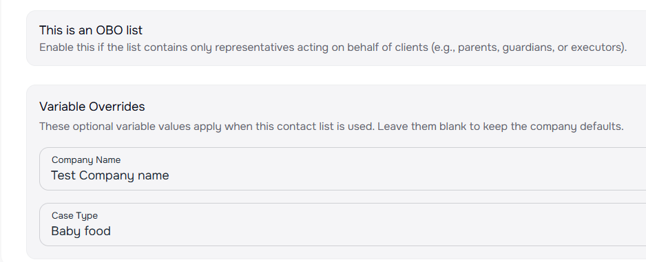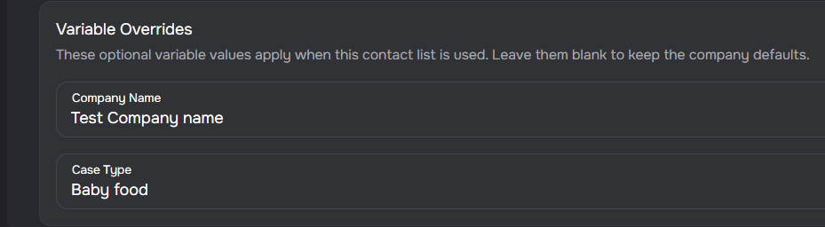 - Override at list level — set custom "Company Name" and "Case Type" values on any contact list; these flow through to all campaigns using that list