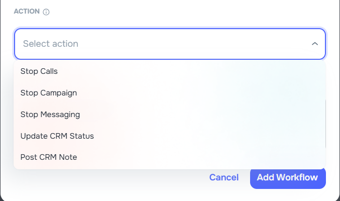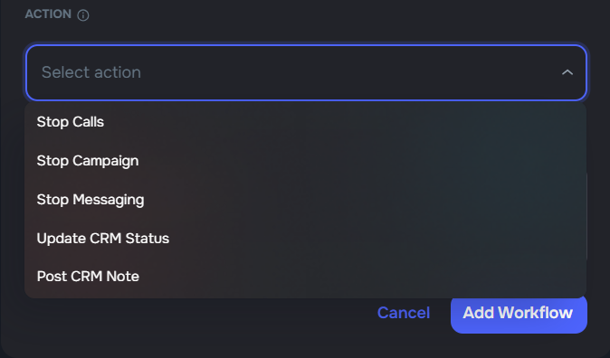 - Always-available notes — no need for a separate "Post CRM Note" action; the note field is available on every workflow regardless of action type
