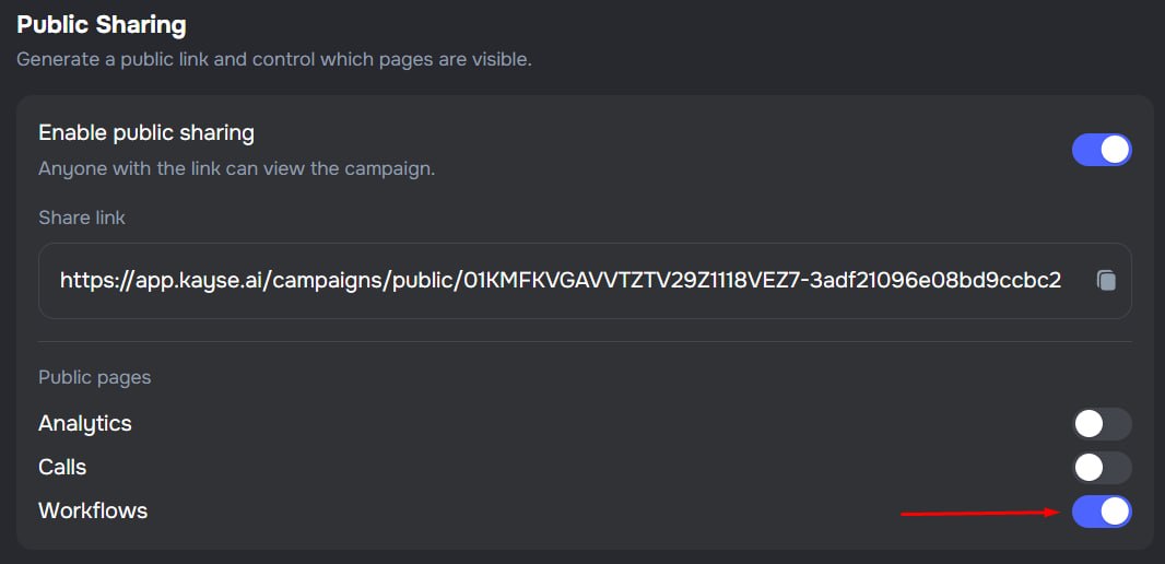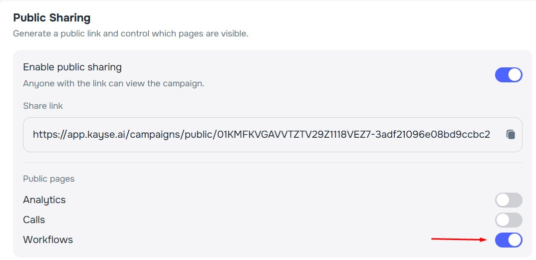 - Workflows tab — when enabled in public settings, external viewers can see campaign workflows and their automation rules