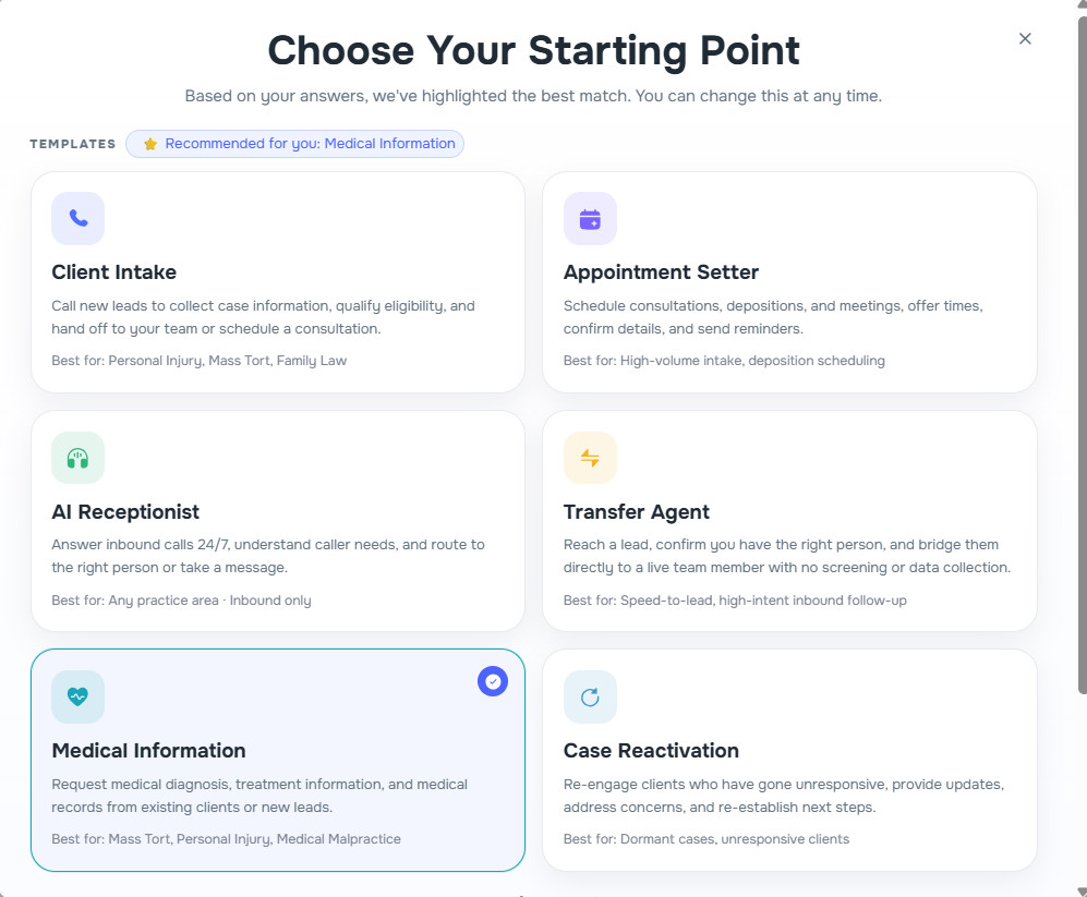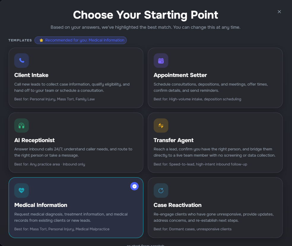 - Smart templates — choose from 8 pre-built templates (Client Intake, Appointment Setter, AI Receptionist, Transfer Agent, Medical Information, Case Reactivation, Form-Based, Custom) matched to your use case