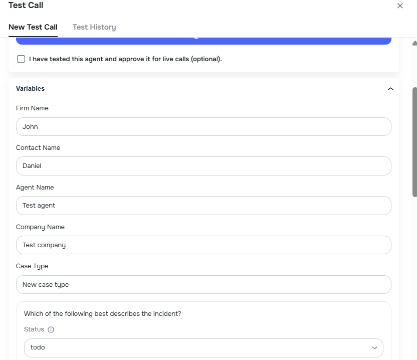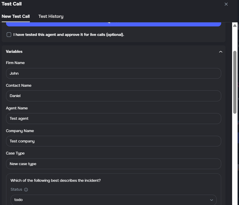 todo) and shown as a dropdown so you can test different status paths directly from the Variables tab - Saved fields in results — post-call analysis custom fields are displayed inline in both the live call result and the test call history, with labels and descriptions mapped from the agent's post-call analysis configuration