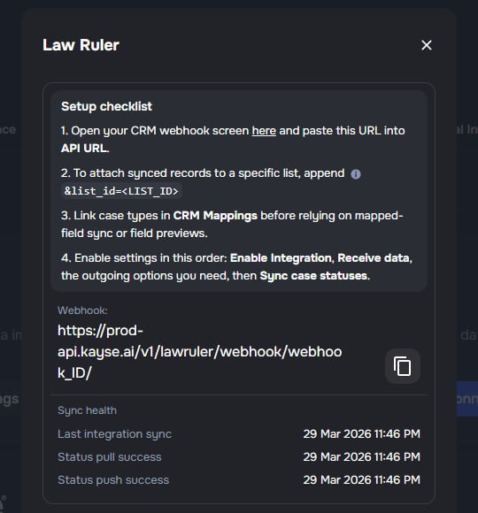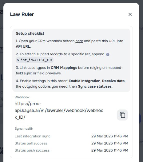 The Law Ruler integration settings now provide more guidance during setup and clearer visibility into sync behaviour.