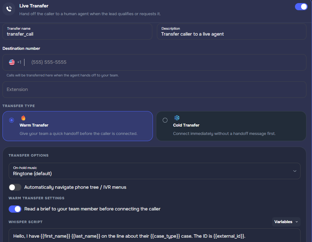 - Full action configuration — configure call transfers (warm/cold, trigger mode, availability hours), SMS, and email directly within the wizard