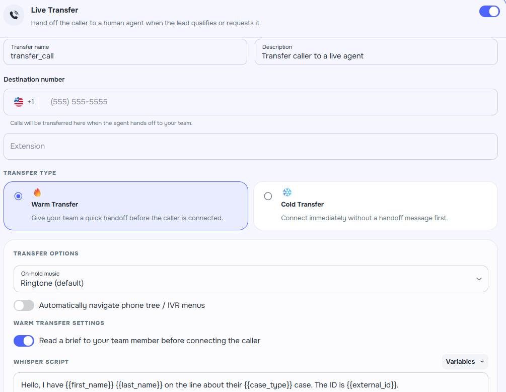 - Updated variable placeholders — welcome messages, voicemail scripts, and action templates now use