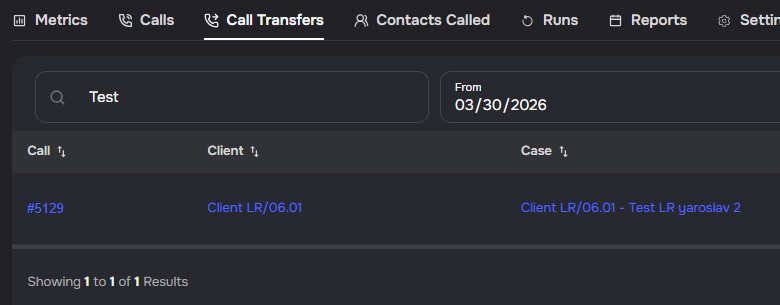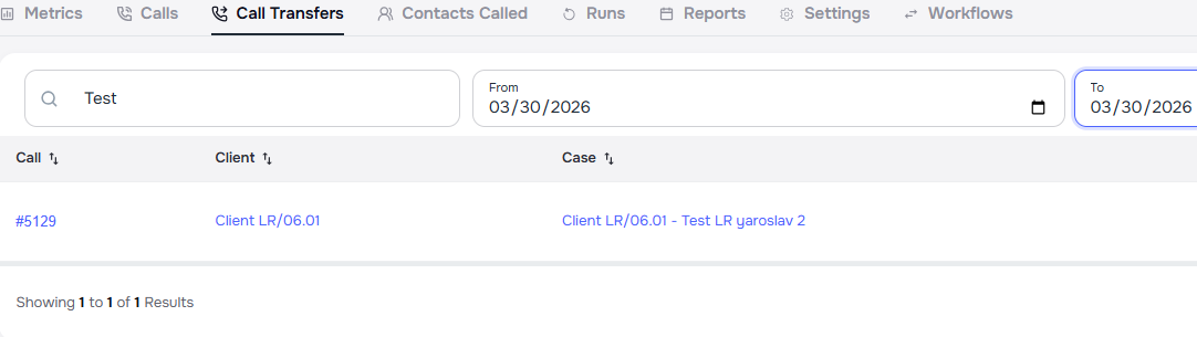- Search transfers — search across call IDs, contact names, phone numbers, case names, and transfer summaries