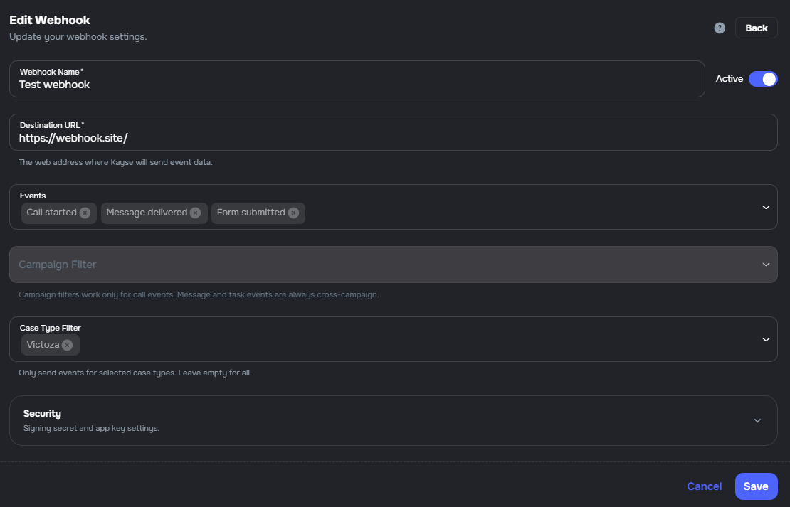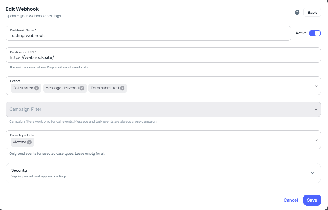 call_started, call_ended, call_analyzed), message_sent (mail, messenger, SMS), task_completed, and form_submitted - Campaign scope — filter by campaign from the webhook form (including from campaign Workflows); call events support campaign filters with validation and helper copy; task-related events respect the same campaign scope when configured