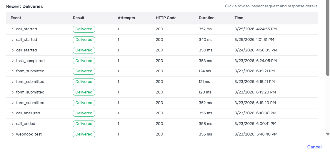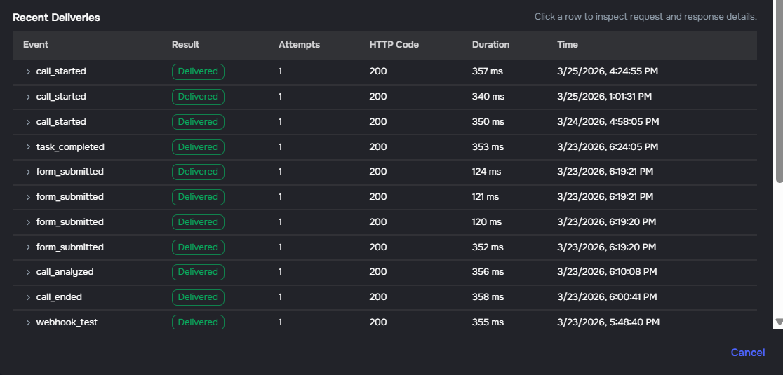 campaign_call_id to identify calls (replacing external_call_id on those payloads) - Reliability — automatic retries with backoff, per-delivery logs, and manual replay for failed deliveries